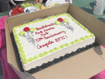 We had a great 50th celebration on Saturday August 16th! Members enjoyed a friendly round robin and were able to connect with other members for future matches. We followed the matches up with a speech by our Vice President, George Brown, who thanked the members for their participation and ongoing support of the club. Next, raffle prizes were drawn by founding member, Frank Wallis, who presented the prizes to three lucky winners! Next came the cake cutting. What a great day! A big thank you to all who helped with this event and to all those who took part in the fun!